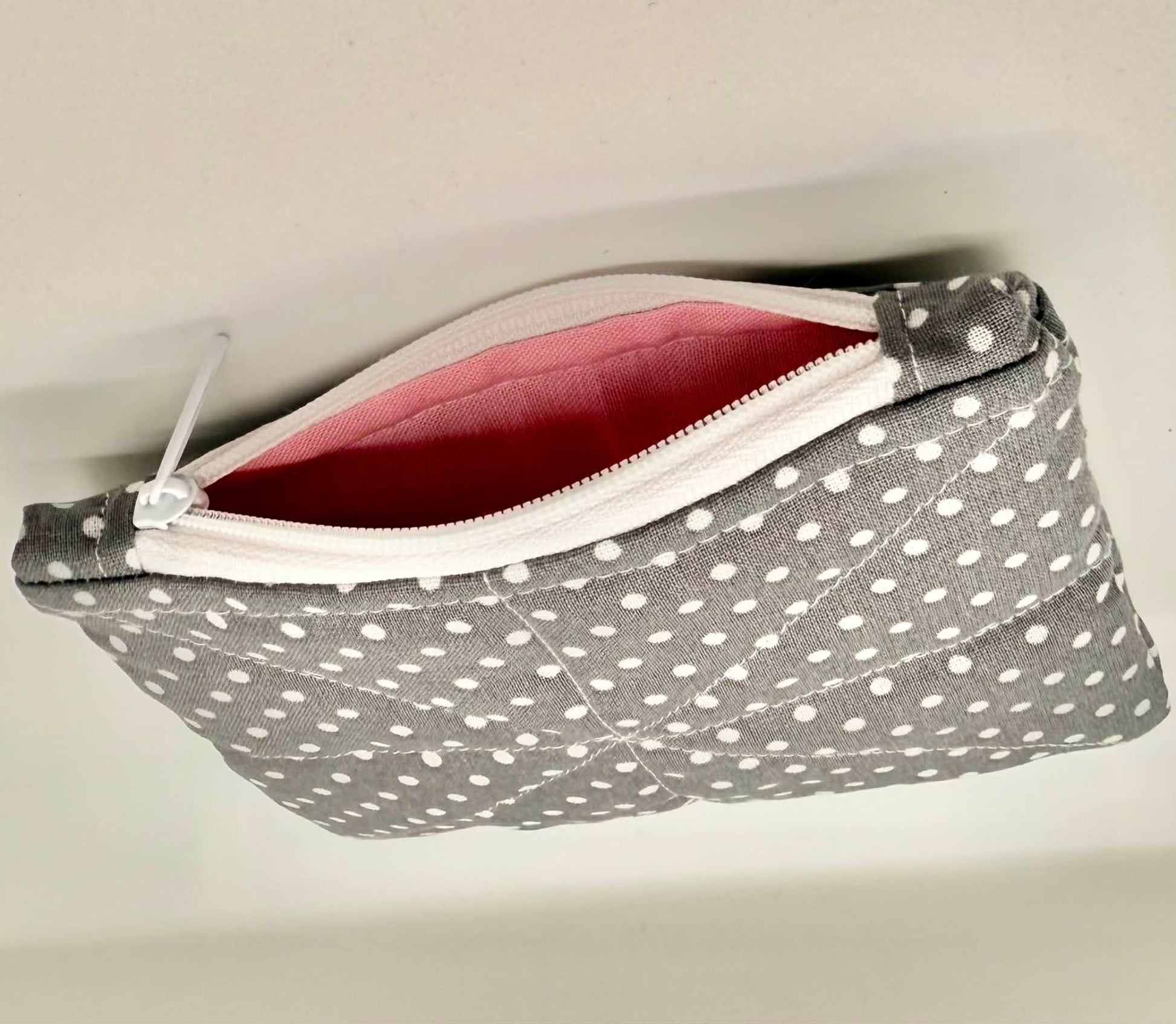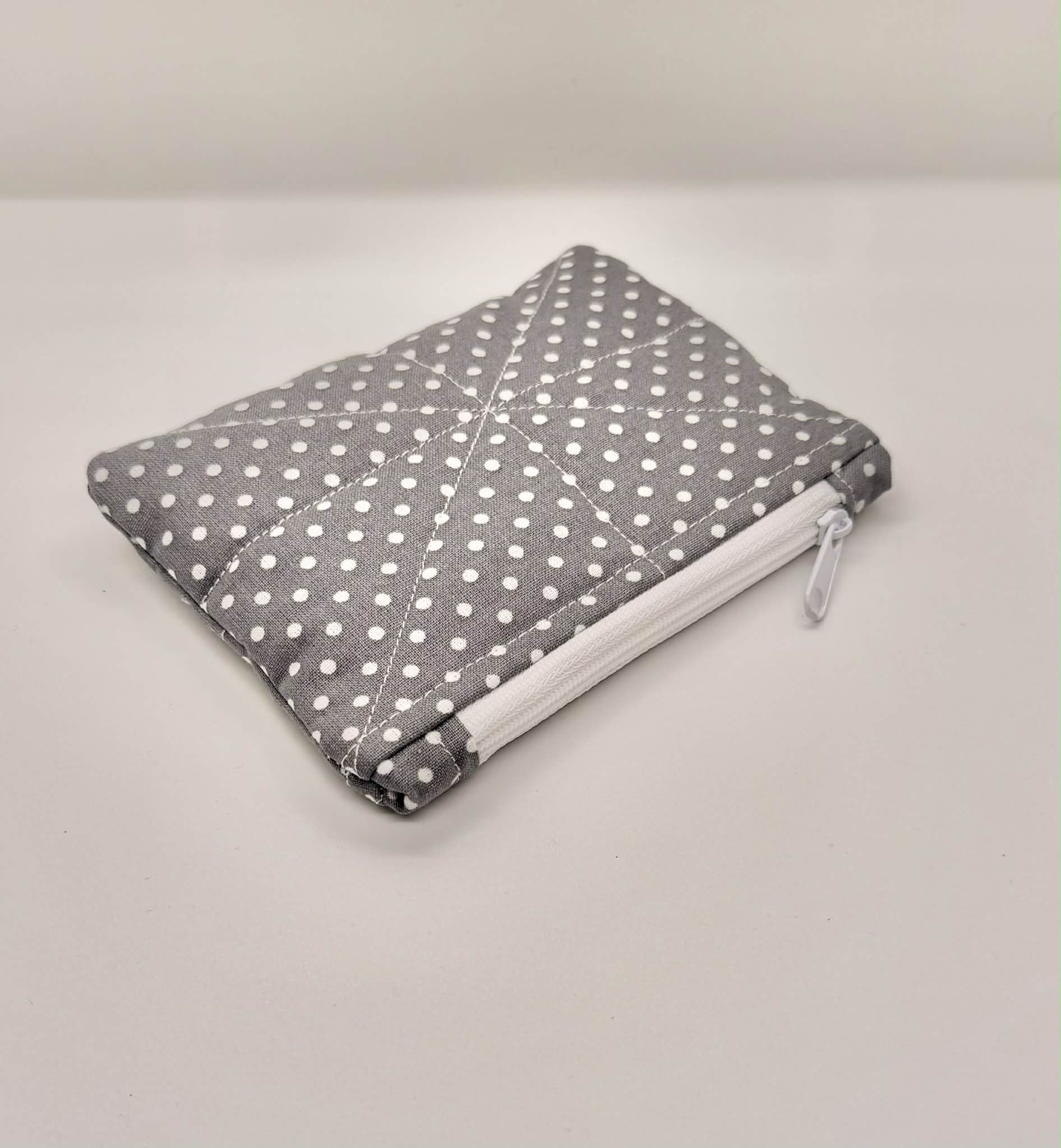 Our handmade zipper pouch is a simple, cozy solution for keeping your small essentials organized and easy to find. Made in our signature Gray Polka Dot fabric, it features soft quilting for gentle structure and protection while staying lightweight and compact.